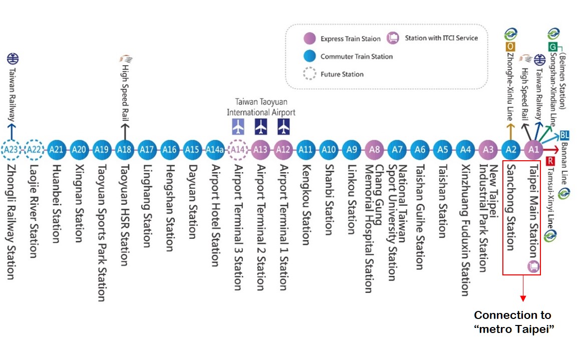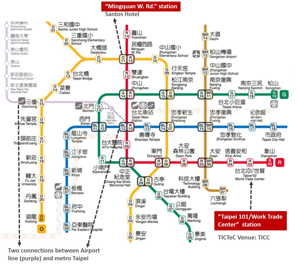 The Taoyuan Airport metro just opened, you can find the sign “metro Taoyuan” in the airport. The route map as below, and the last stop “Taipei Main Station” can transfer to many lines which can arrive the hotel and CSCS venue.